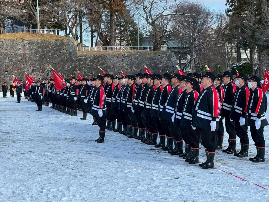 比較的暖かく、快晴の下での挙行となりました。消防団の皆様の日頃の活動に感謝するとともに、今年一年、火災や災害のない、穏やかな日々が続くことを心から願っています。