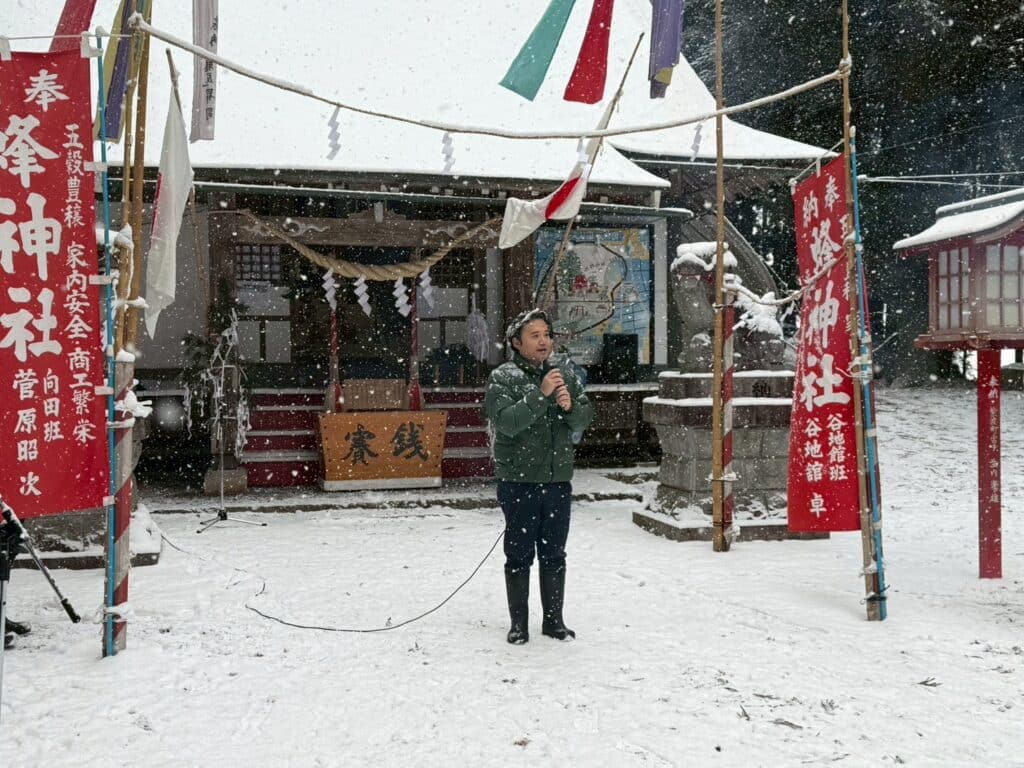 雪が降りしきる中、新年を迎えた厳かな雰囲気の中、沢山の方が集まり神事が執り行われ、新年のご挨拶もさせて頂きました。